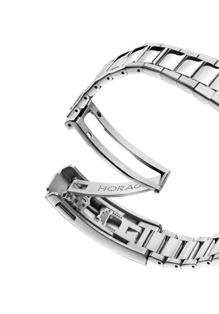 The ultra-thin 904L stainless steel integrated bracelet tapers from 22mm to 16mm at the buckle allowing for a comfortable fitment, enhanced with Horage’s propriety micro-adjustment buckle, allowing for 10mm of adjustment on the go.